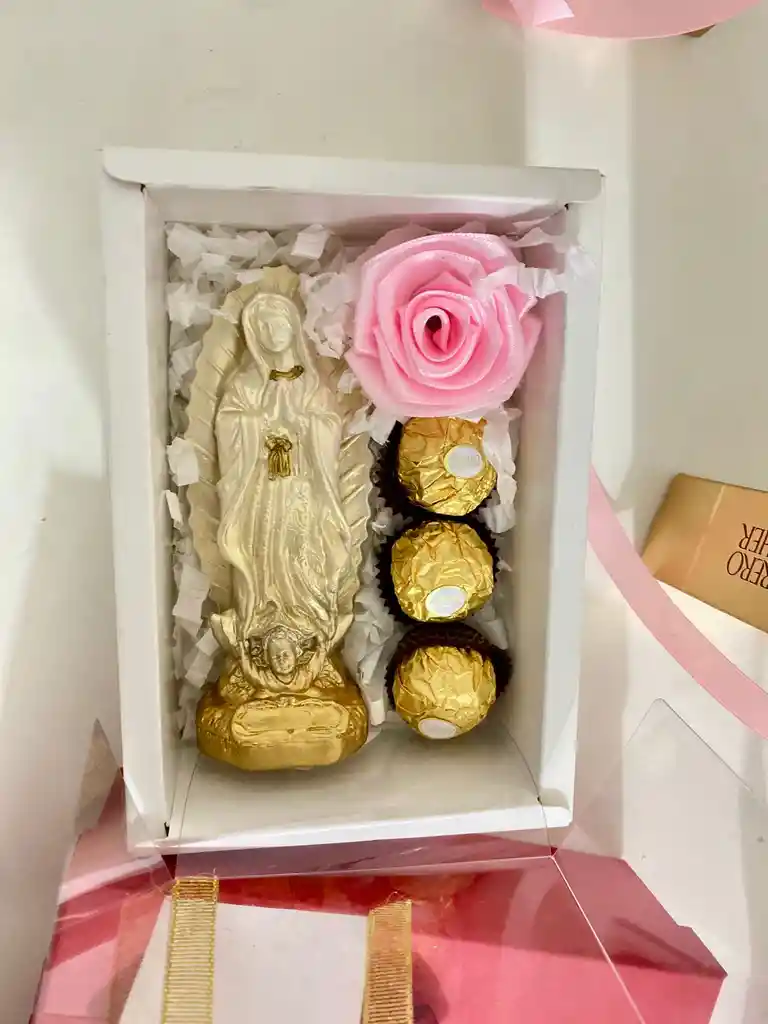 Linda cajita con Virgen María en yeso, rosa hecha a mano y trío de Ferrero Rocher. Decoración con cintas y tarjeta Feliz Día.