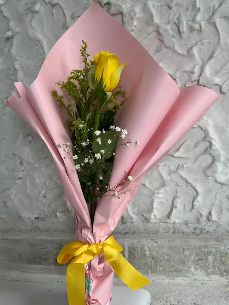 ROSA AMARILLA CON FOLLAJE DECORADA CON PAPEL Y CINTA RASO