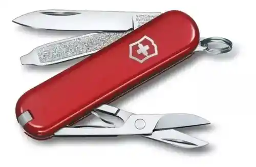 Navaja Classic de 7 Usos Victorinox Características: Hoja pequeña. Tijeras. Lima de uñas. Limpia de uñas. Destornillador de 2.5 mm. Palillo de dientes. Pinzas. Cuchilla. Llavero. Largo 5cm ancho 1cm