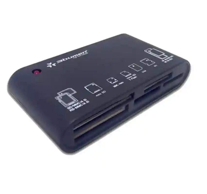 UNILACOMPRAS ¯¯¯¯¯¯¯¯¯¯¯¯¯¯¯¯¯¯¯¯¯¯¯¯¯¯¯¯¯¯¯¯¯¯¯¯¯¯¯¯¯¯¯¯¯¯¯¯¯¯¯ LECTOR DE MEMORIAS Y SIMCARD EXTERNO USB 2.0 3BUMEN 38 EN 1 Compacto accesorio portatil que permite leer Memorias de varios tipos con conexion USB 2.0 Lector Multi tarjeta 38 en 1 Este sorprendente lector de tarjetas 38 en 1 le otorga la máxima comodidad ya que le permite transferir fácilmente sus archivos, imágenes y música hacia su computadora o laptop desde su teléfono móvil, cámara digital o cámara de video y PDA, a una sorprendente velocidad de transmisión. Puede usarlo con 38 diferentes tipos de tarjetas. Su practico tamaño le permite llevarlo a cualquier lugar, en el momento que lo desee. Incluido el nuevo formato de tarjeta M2 de SONY Memorias que puede leer SD SDHC MMC MMC 4.0 RS-MMC MMC-PLUS MMC Mobile MMC Micro Mini SD MS MS Pro MS Duo MS Pro Duo Lee SIM CARD de operadores: Comcel, movistar, Tigo, Uff, Telcell, Nextel, Unefón, Lusacel, Claro, Telecom y la gran mayoria de Latinoamérica. Incluye Software para administrar tus contactos. Compatible con: SD/ SDHC/ MMC/ MMC 4.0/ RS-MMC/ MMC PLUS/ MMC Mobile/ MMC Micro/ mini SD MS/ MS Pro/ MS Duo/ MS Pro Duo. Compatible Windows