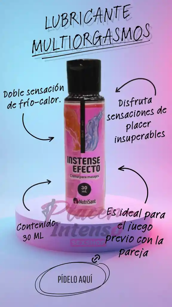 La mejor combinación para un orgasmo y un delicioso sexo oral (saborizado). Disfruta sensaciones de placer insuperables y alcanza múltiples orgasmos con el Gel Multiorgasmos Intense Efecto con doble sensación de frío-calor. Es ideal para el juego previo con la pareja y descubrir las zonas de mayor sensibilidad. Características del Gel Multiorgasmos Intense Efecto Frío- Caliente Contenido: 30 ml A base de agua Extractos naturales pH balanceado