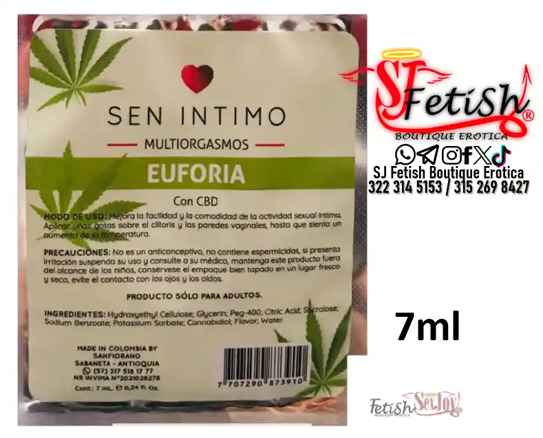 Lub. Multiorgasmos Euforia Con CBD Sachet 7ml ¡Renueva tu relación con sensaciones intensas! Con Extracto de cannabis sativa, te permitirá mejorar la lubricación y experimentar intensas sensaciones de placer. Modo de uso: Aplicar sobre la zona íntima o sobre el preservativo. Apto para sexo oral y penetración. Precauciones: No es un anticonceptivo, no contiene espermicidas. Si presenta irritación suspenda su uso y consulte a su médico. Manténgase en un lugar fresco y seco, fuera del alcance de los niños. Con componentes naturales que no alteran el PH de tu zona íntima. Seguro con preservativos y juguetes. Ideal para sexo oral. No contiene THC. A base de agua. Disponible en sj fetish boutique erotica, boutique erotica, boutique erotica armenia, sex shop, sex shop armenia, tienda erotica, tienda erotica armenia, sexshop, sexshop armenia, tienda para adultos, tienda para adultos en armenia, tienda para adultos armenia