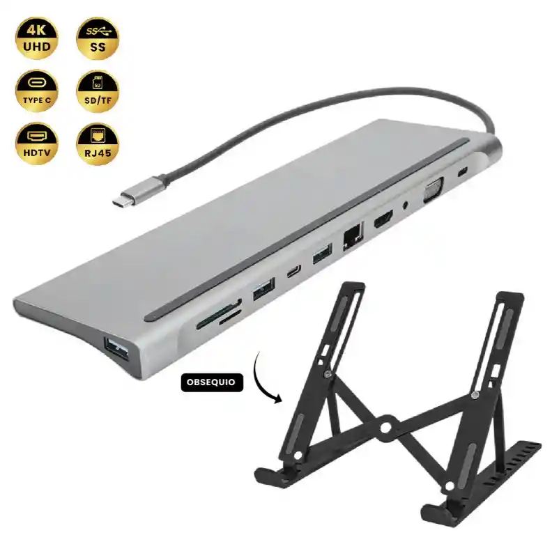 Convierte tu laptop en una estación de trabajo completa con el Hub Innovo+ 11 en 1, que además incluye un soporte ergonómico ajustable para mayor comodidad y productividad. 11 puertos en 1: HDMI 4K, VGA, USB 3.0, USB 2.0, RJ45, USB-C, PD, lector SD/TF y salida de audio. Compatible con laptops y MacBook (Windows, macOS, Chromebook y más). Soporte plegable y ergonómico con 6 niveles de altura, ideal para reducir fatiga de cuello y espalda. Diseño en aluminio con disipación de calor eficiente para laptops de alto rendimiento. Conectividad total: conecta monitores, teclados, mouse, proyectores, discos duros, memorias USB y mucho más. Portátil y compacto, perfecto para oficina, teletrabajo, viajes o estudio. Beneficios: Mayor productividad con múltiples pantallas y dispositivos conectados. Resolución 4K UHD en HDMI para presentaciones y trabajo gráfico. Internet estable con puerto RJ45 Ethernet. Carga rápida PD para laptops y dispositivos móviles. Soporte plegable ligero, fácil de guardar y transportar. Medidas del hub: 25 cm x 8 cm x 1.9 cm Medidas del soporte: 28 cm x 21 cm x 20 cm