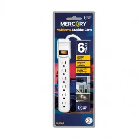 Multitoma 6 Salidas Mercury La Multitoma Mercury ofrece 6 salidas protegidas con supresor de picos y desconexión automática por alto y bajo voltaje. Ideal para proteger tus dispositivos contra apagones y fluctuaciones eléctricas. Incluye botón de encendido y cable de alimentación de calibre 3X14 AWG. * Color: Blanca * Tensión: 127V * Corriente: 15A * Potencia: 1800W * Frecuencia: 60 Hz * Toma: 6 X NEMA 5-15R (Polo a tierra) * Temperatura de operación: Máxima 50°C * Marca: Mercury