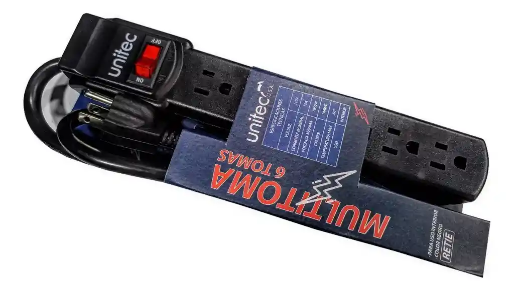 Optimiza la distribución de energía en tus espacios con la Multitoma 6 Tomas 14AWG, ideal para uso doméstico e interior. - Longitud del cable: 90 cm para una mayor flexibilidad en la ubicación. - Tensión nominal: 110V, adecuada para la mayoría de dispositivos eléctricos. - Corriente nominal: 15A, soporta múltiples aparatos simultáneamente. - Calibre del cable: 14 AWG encauchado, garantizando resistencia y seguridad. - Conductores: 3C, para una conexión segura y estable. - Potencia máxima: 1650W, ideal para electrodomésticos y equipos electrónicos. - Material de cobertura: PVC color gris, duradero y flexible. - Cable con marcación en relieve: Facilita la identificación y seguridad. - Certificación Retie: Cumple con los estándares de seguridad. - Interruptor de encendido: Controla fácilmente el suministro de energía.