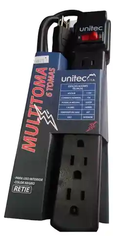 Longitud del cable: 3 METROS , Tensión nominal: 110V, corriente nominal:15A, calibre: 14 AWG encauchetada, conductores: 3C, potencia máxima: 1.430W, material de recubrimiento: PVC color gris, cable con marcación en relieve, para uso en interiores. Certificado Retie, Regleta con 6 salidas, interruptor de encendido.