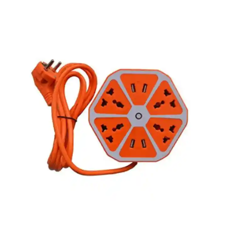 Multitoma Hexagonal con capacidad para conectar de forma segura hasta 7 accesorios y/o dispositivos móviles. Viene con 5 adaptadores de enchufe con salida de 3 patas homologadas y 2 puertos USB. Su diseño moderno de 360° es ideal para la casa u oficina, y evitar problemas de uso con muchos enchufes anchos al mismo tiempo.