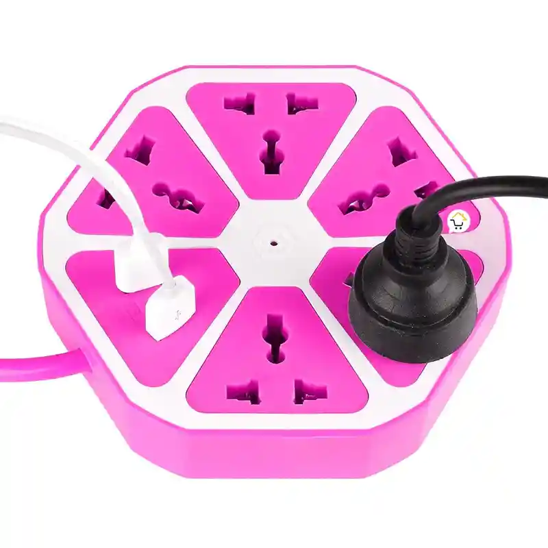 Multitoma Hexagonal con capacidad para conectar de forma segura hasta 7 accesorios y/o dispositivos móviles. Viene con 5 adaptadores de enchufe con salida de 3 patas homologadas y 2 puertos USB. Su diseño moderno de 360° es ideal para la casa u oficina, y evitar problemas de uso con muchos enchufes anchos al mismo tiempo.