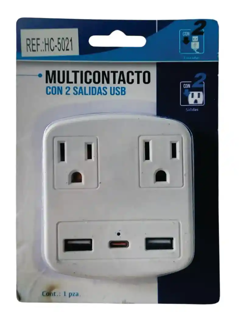multicontacto de pared con salidas USB Este multicontacto permite conectar dispositivos que requieren tomas de corriente estándar (tipo A/B en América) y también cargar dispositivos móviles a través de sus puertos USB (uno tipo A y otro tipo C). Es una solución práctica para expandir el número de conexiones disponibles en una toma de pared, ideal para espacios donde se necesitan cargar múltiples dispositivos simultáneamente. Ofrece la conveniencia de cargar dispositivos USB sin necesidad de adaptadores de corriente adicionales, utilizando directamente los puertos integrados.