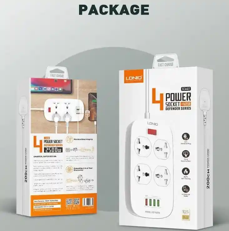 Multitoma Ldnio Sc4407 De 4 Puertos Con Usb Carga Rápida 18w Extensión Toma Corriente Ldnio SC4407 Adaptador 4 Power Socket 4 Usb Blanco LDNIO SC4407 Cuatro enchufes universales Combo 4 puertos USB Soporte QC3.0 Extensión de carga rápida Tira de alimentación universal de CA, cable de 2 metros. Producto LDNio genuino con marca de seguridad y certificación CE Modelo SC4407Salida universal Protección de sobrecarga (botón rojo) Longitud del cable de 2 metros4 puertos USB (salida 3.4A / 17W) con un solo puerto Quick Charge 3.0 (18W) Material de PC ignífugo Potencia nominal 2500 W