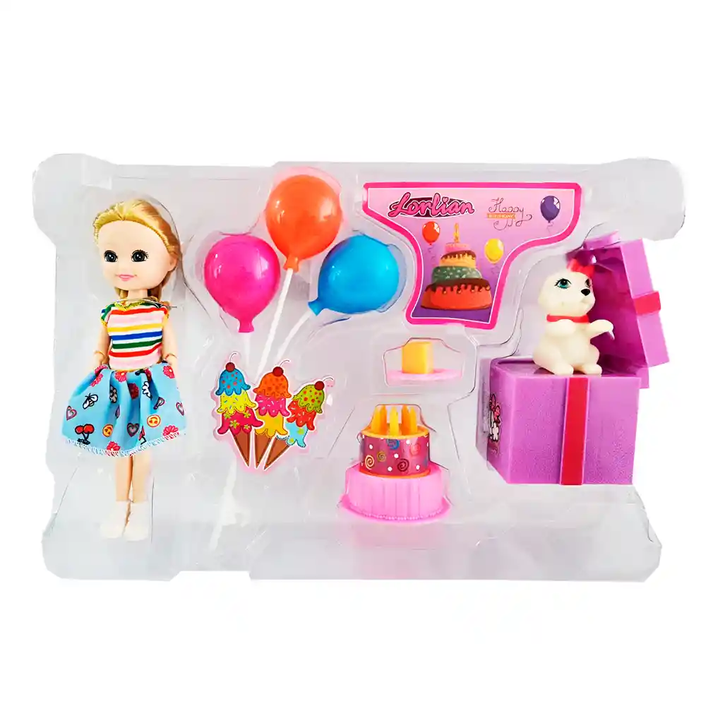 Esta adorable muñeca viene acompañada de su mascota, globos, una torta y un letrero de cumpleaños, creando el escenario perfecto para celebrar una divertida fiesta. Con todos estos accesorios, las niñas podrán recrear momentos especiales, inventar historias y desarrollar su creatividad mientras juegan, convirtiendo cada ocasión en una experiencia llena de alegría y fantasía. Ficha Técnica: Dimensiones de la Figura: 15 cm x 4 cm Dimensiones del empaque: 28 cm x 17 cm x 5 cm Materiales: Plástico ABS no toxico Edad recomendada: + 3 años Certificado de conformidad: SL-CS-210044 Referencia: HB072 ** _Para defectos de fábrica o retractos: \_Por favor revise el producto apenas lo reciba y antes de usarlo. No aplican ley de retracto o defectos de fábrica luego de usar el producto. Se manejan máximo 5 días para reportar defectos de fábrica (por ejemplo, producto funciona mal, piezas faltantes, rotas, etc). Para hacer efectiva la devolución el producto debe devolverse con el empaque original, el cual debe estar en buen estado, incluir todos los documentos y las partes completas y sin daños.