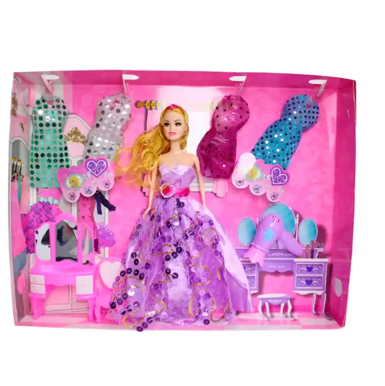 ¡Deja que la imaginación y la diversión se unan con la Muñeca Princesa Accesorios Belleza! Esta encantadora muñeca viene acompañada de accesorios para un salón de belleza real. Con cinco hermosos vestidos, un tocador completo con espejo, silla y un secador de pelo, esta muñeca ofrece una experiencia de juego inigualable para los pequeños amantes de las historias de princesas y la moda. Características principales: Juego de vestuario variado: Incluye cinco elegantes vestidos para cambiar el estilo de la muñeca princesa. Tocador completo: El tocador viene equipado con un espejo, ofreciendo un espacio perfecto para jugar a arreglar y peinar. Accesorios detallados: Además de los vestidos y el tocador, se incluye una silla y un secador de pelo para más diversión y realismo. Material duradero: Fabricada en ABS resistente para garantizar durabilidad y seguridad durante el juego. Ficha técnica: Nombre del producto: Muñeca Princesa Accesorios Belleza con Vestidos, Tocador y Secador Material: Plástico ABS Incluye: Muñeca princesa, 5 vestidos, tocador con espejo, silla, secador de pelo Dimensiones de la caja: 43 cm (largo) x 32 cm (ancho) Edad recomendada: A partir de 3 años Advertencias: Piezas pequeñas, riesgo de asfixia para menores de 3 años.