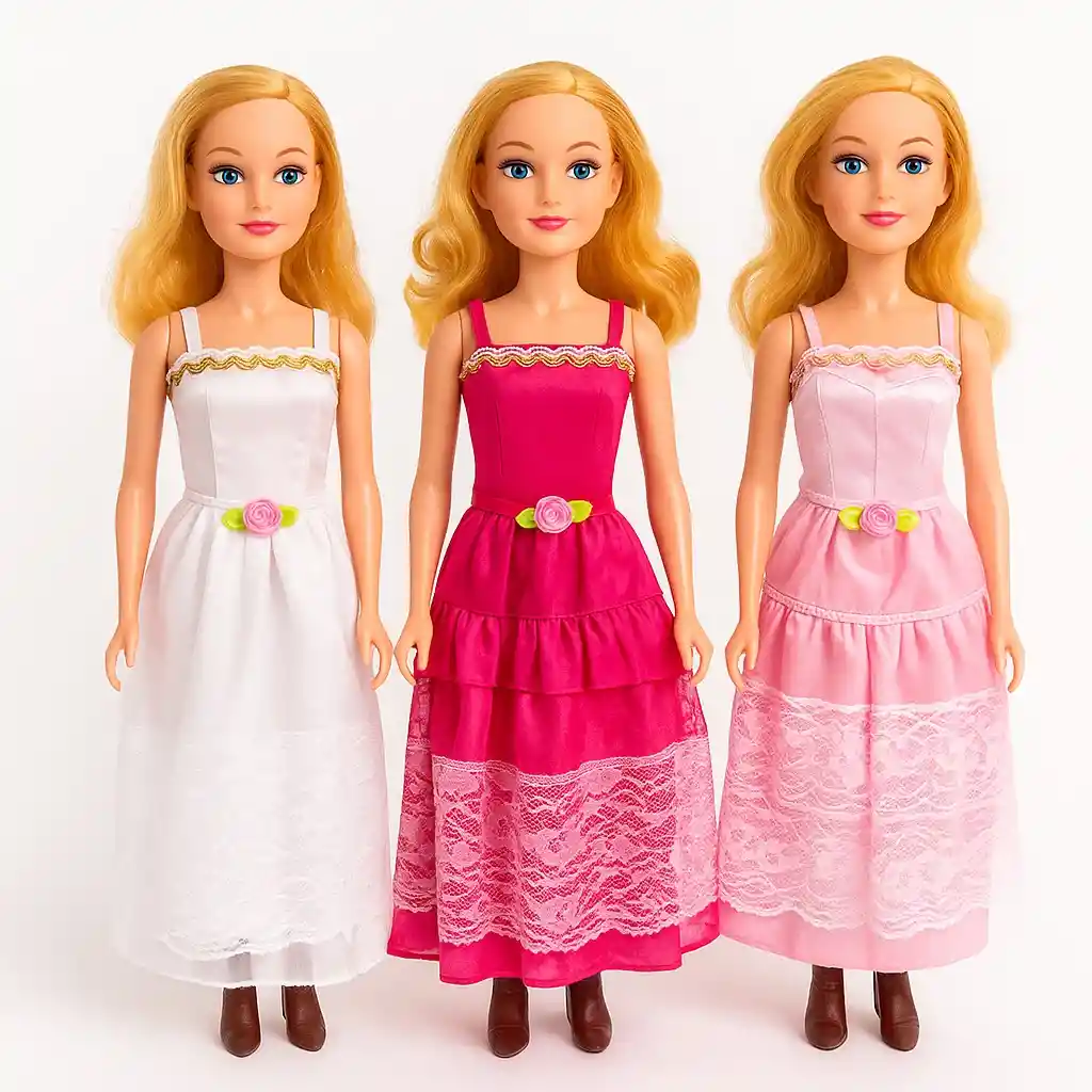 Material: Plastico🎁 Medida: 33cm🛍 Color Vestido: Rosa Fiscia, Blanco