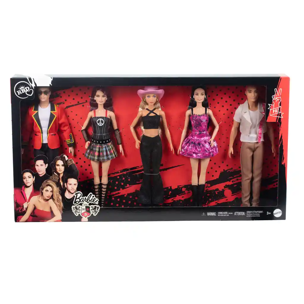 ¡Barbie celebra el regreso de RBD con un set de cinco muñecos listos para subir al escenario! Roberta, Mia, Lupita, Diego y Giovanni lucen atuendos que resaltan su personalidad y estilo. Sus looks están inspirados en sus vestuarios del concierto con accesorios fabulosos. Forma parte de este reencuentro añadiéndolos a tu colección. Las muñecas no se pueden mantener de pie por sí solas. Los colores y decoraciones pueden variar. Fabricante: Mattel Importador: Mattel Colombia Recomendaciones: Requiere de la supervisión directa de un adulto, puede contener partes pequeñas, riesgo de asfixia o ahogamiento, no destinar este juguete para menores por debajo de la edad establecida en la etiqueta. Edad mínima sugerida: 3 años Lote: Dato variable. Se puede verificar en el sticker que trae el producto físico. Fecha de fabricación: Dato variable. Se puede verificar en el sticker que trae el producto físico.