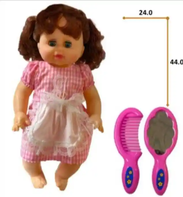 Descripción del producto – Muñeca Niña con Accesorios Encantadora muñeca infantil con diseño clásico y detalles delicados, ideal para el juego de roles y el desarrollo de la imaginación. La muñeca luce un vestido rosado a cuadros con encaje, cabello peinado en coletas y expresión tierna que invita al cuidado y la diversión. Incluye accesorios para peinar, como peine y cepillo, para que los niños disfruten arreglando su cabello y creando distintos estilos. Medidas aproximadas: Altura: 44 cm Ancho: 24 cm Características: Muñeca con apariencia realista Incluye peine y cepillo Vestido con acabados delicados Material resistente y seguro Fomenta la creatividad y el juego simbólico Recomendada para niños y niñas Ideal como regalo y compañera de juegos para horas de entretenimiento. 🎀👧
