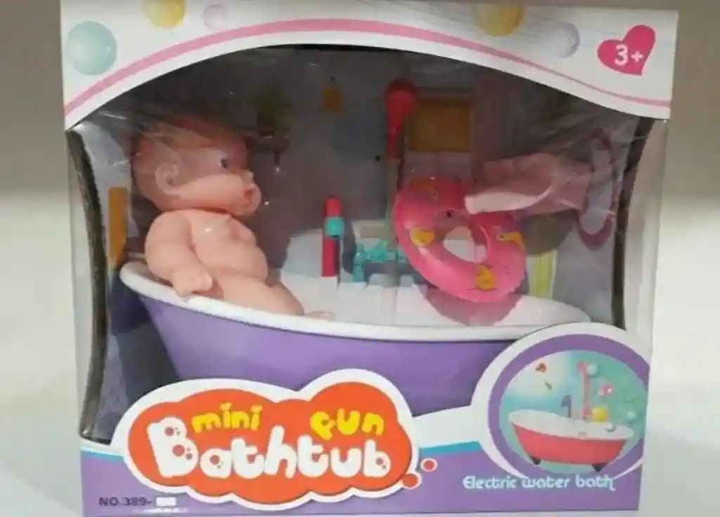 Somos Danny Toys ofrecemos hermosa muñeca con Bañera. *La bañera es funcional. *Requiere 4 pilas AA (no inclidas). Medidas Bebe: 16cm alto. Bañera:26cmx13cmx10cm. Contiene: *Muñeca Bebé. *Bañera. *flotador. *Toalla. Medidas Bañera: 26cmx12cm. Requiere 4 baterías AA.