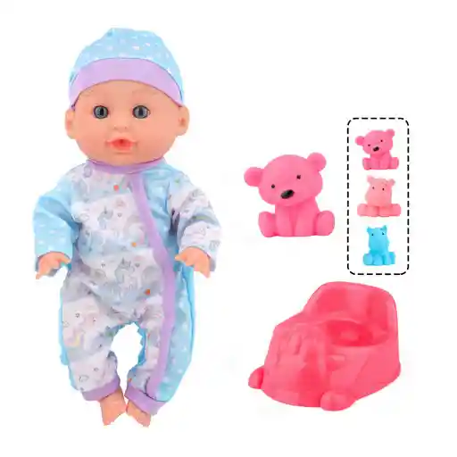 Muñeco bebé de 12 pulgadas con accesorios, cuerpo plástico y cabeza de vinilo. Contiene 3 Piezas , Muñeca bebé *1, orinal de oveja *1, animal de vinilo aleatorio *1 und. Edad 5 a 7 años . Los productos están garantizados por defecto de materiales y mano de obra por un período de 30 días.