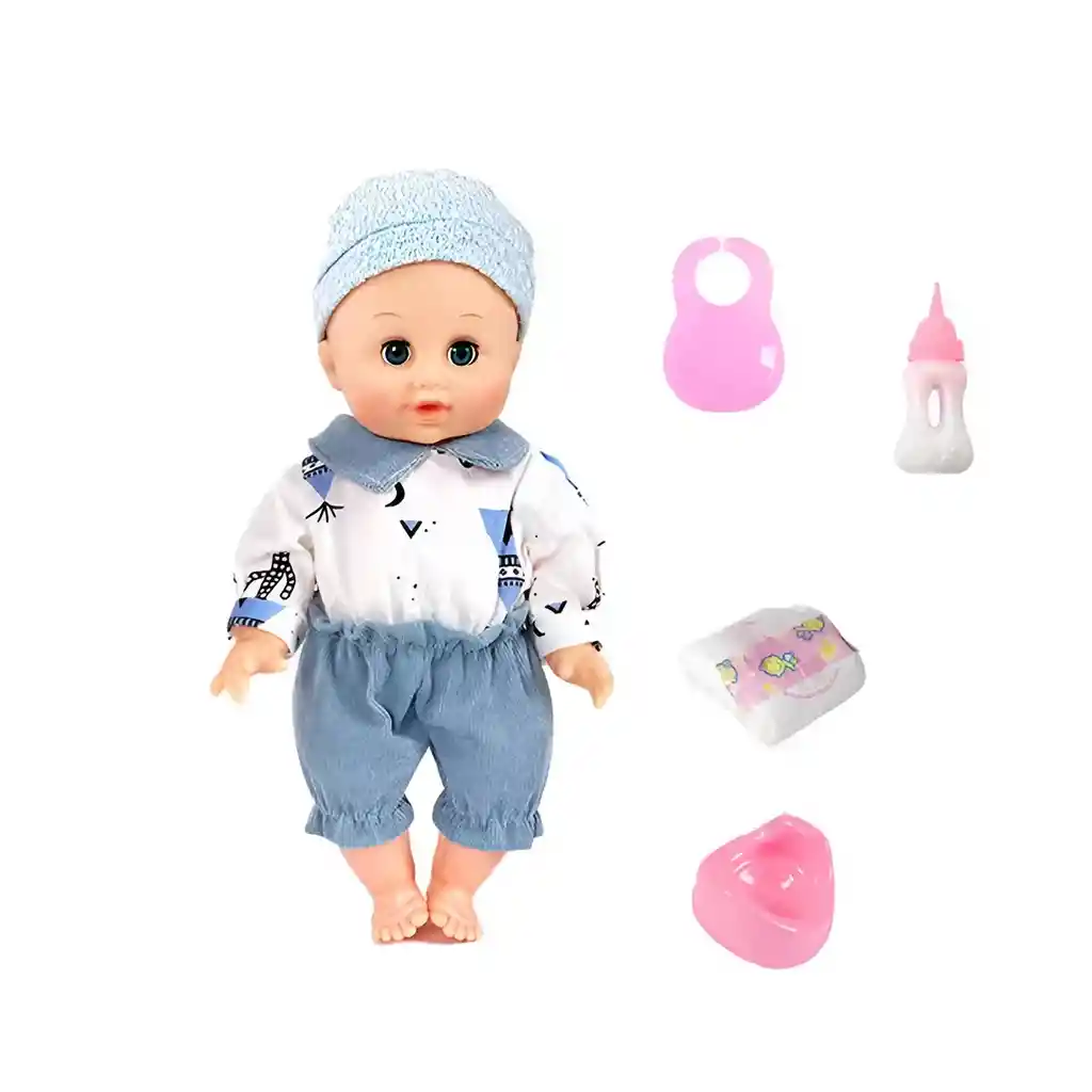 Esta tierna muñeca bebé viene acompañada de un tetero, un pañal y una vacinilla, ofreciendo a las niñas todo lo necesario para disfrutar de horas de juego mientras cuidan de su bebé, fomentando la creatividad, la empatía y el desarrollo de habilidades a través de un juego imaginativo y divertido. /// Nota: Algunos colores de la pijama pueden variar /// Ficha Técnica: Material: Plástico libre de BPA Dimensión de la muñeca: 32 cm x 15 cm Dimensión del empaque: 33 cm x 29 cm x 11 cm Apto para niños + 3 Años Referencia: MU1007 Certificado de conformidad: CS-LCO-13233-2021S2/432 ** _Para defectos de fábrica o retractos: \_Por favor revise el producto apenas lo reciba y antes de usarlo. No aplican ley de retracto o defectos de fábrica luego de usar el producto. Se manejan máximo 5 días para reportar defectos de fábrica (por ejemplo, producto funciona mal, piezas faltantes, rotas, etc). Para hacer efectiva la devolución el producto debe devolverse con el empaque original, el cual debe estar en buen estado, incluir todos los documentos y las partes completas y sin daños.