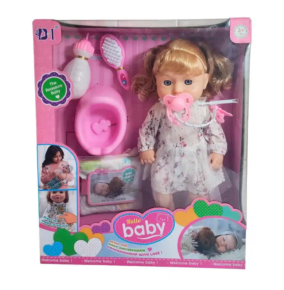 Hermosa muñeca Hello Baby con vestido floral y cabello rubio recogido en coletas, perfecta para acompañar los juegos de cuidado y ternura. Incluye accesorios como biberón, cepillo, chupo con cadena, pañal y orinal, ideales para recrear momentos de atención y aprendizaje. Su diseño realista y materiales suaves fomentan el juego imaginativo, ayudando a desarrollar la empatía y el sentido de responsabilidad en los niños. Recomendado para mayores de 3 años. Ficha Técnica: Dimensiones del carro : 34 cm x 12 cm Material: Plástico ABS Edad recomendada + 3 Años Referencia: JM-1270 P9735 Certificado de conformidad: CS-LCO-13233-2021S2/432 ** _Para defectos de fábrica o retractos: \_Por favor revise el producto apenas lo reciba y antes de usarlo. No aplican ley de retracto o defectos de fábrica luego de usar el producto. Se manejan máximo 5 días para reportar defectos de fábrica (por ejemplo, producto funciona mal, piezas faltantes, rotas, etc). Para hacer efectiva la devolución el producto debe devolverse con el empaque original, el cual debe estar en buen estado, incluir todos los documentos y las partes completas y sin daños.