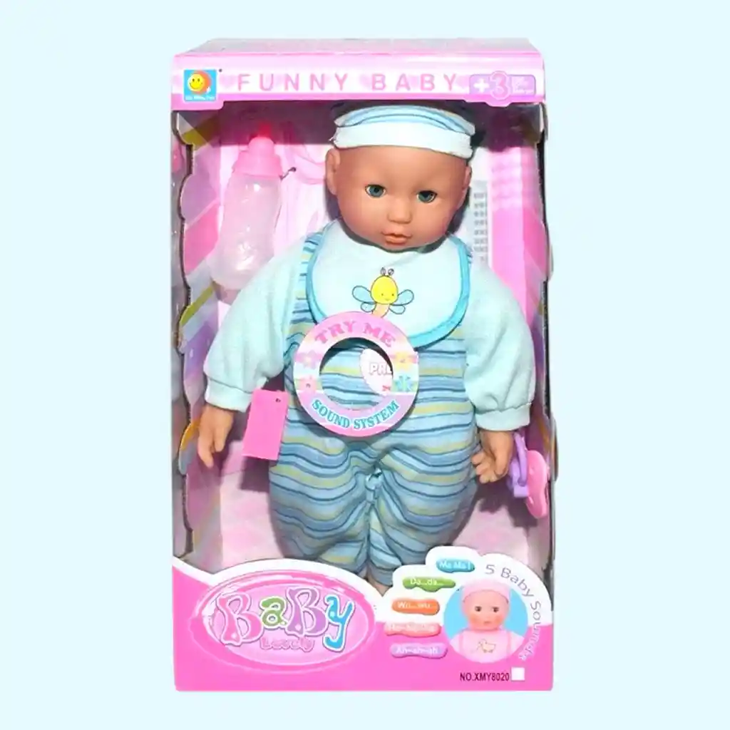 Un lindo muñeco que emite 5 sonidos de bebé, como risas y las palabras mama-mama, da-da y más. Cuando habla, las mejillas de la muñeca se sonrojan. Está vestida con un lindo mono, gorro y babero y va acompañada de un biberón y un chupete. El juguete despertará la imaginación de los pequeños soñadores, inspirándolos para diversos juegos de rol que desarrollan la imaginación y las habilidades sociales. El conjunto incluye: Picardias Biberón Chupete Altura: 34 cm Funciona con pilas (no incluidas)