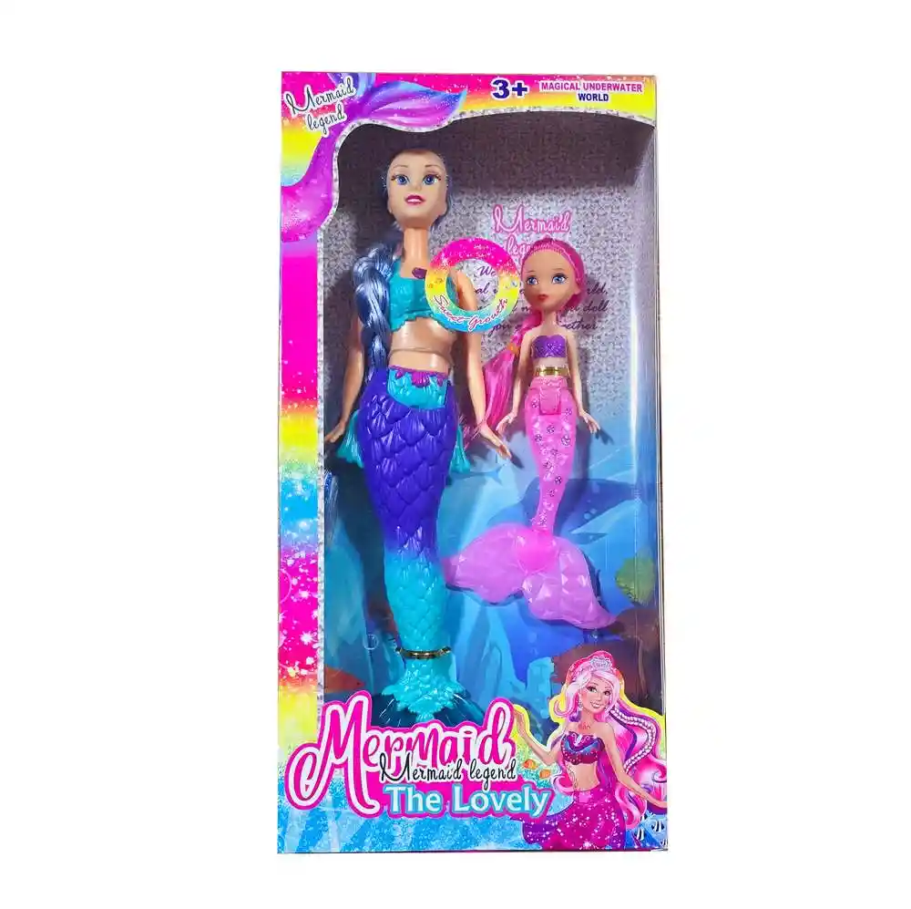 Sumérgete en un mundo de fantasía con esta muñeca de sirena con una deslumbrante cola multicolor, acompañada de una muñeca más pequeña que representa a su hija, también con una encantadora cola de sirena. Juntas, forman un dúo perfecto para crear emocionantes aventuras bajo el mar, fomentando la imaginación y el juego creativo, mientras exploran océanos mágicos y descubren tesoros escondidos en las profundidades. Ficha Técnica: Dimensiones de la muñeca: 29 cm x 9 cm Dimensiones del empaque: 32 cm x 12 cm x 6 cm Material: Plástico ABS no toxico Edad recomendada + 3 Años Certificado de conformidad: CS-LCO-13233-2021S2/432 Referencia: 619A1 ** _Para defectos de fábrica o retractos: \_Por favor revise el producto apenas lo reciba y antes de usarlo. No aplican ley de retracto o defectos de fábrica luego de usar el producto. Se manejan máximo 5 días para reportar defectos de fábrica (por ejemplo, producto funciona mal, piezas faltantes, rotas, etc). Para hacer efectiva la devolución el producto debe devolverse con el empaque original, el cual debe estar en buen estado, incluir todos los documentos y las partes completas y sin daños.