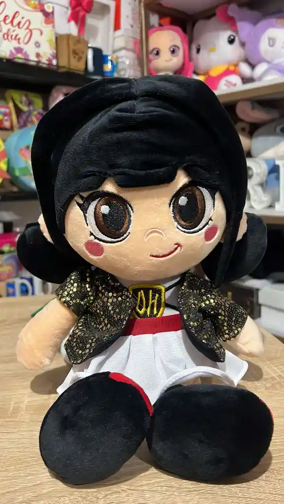 Muñeca de trapo estilizada de Hana del grupo Guerrera. Luce su outfit oficial con chaqueta negra y dorada, falda blanca con cinturón rojo y su característico peinado oscuro con flequillo. Felpa suave de microfibra, cabello en peluche corto color negro azabache, chaqueta con detalles dorados metalizados y relleno de algodón siliconado premium.