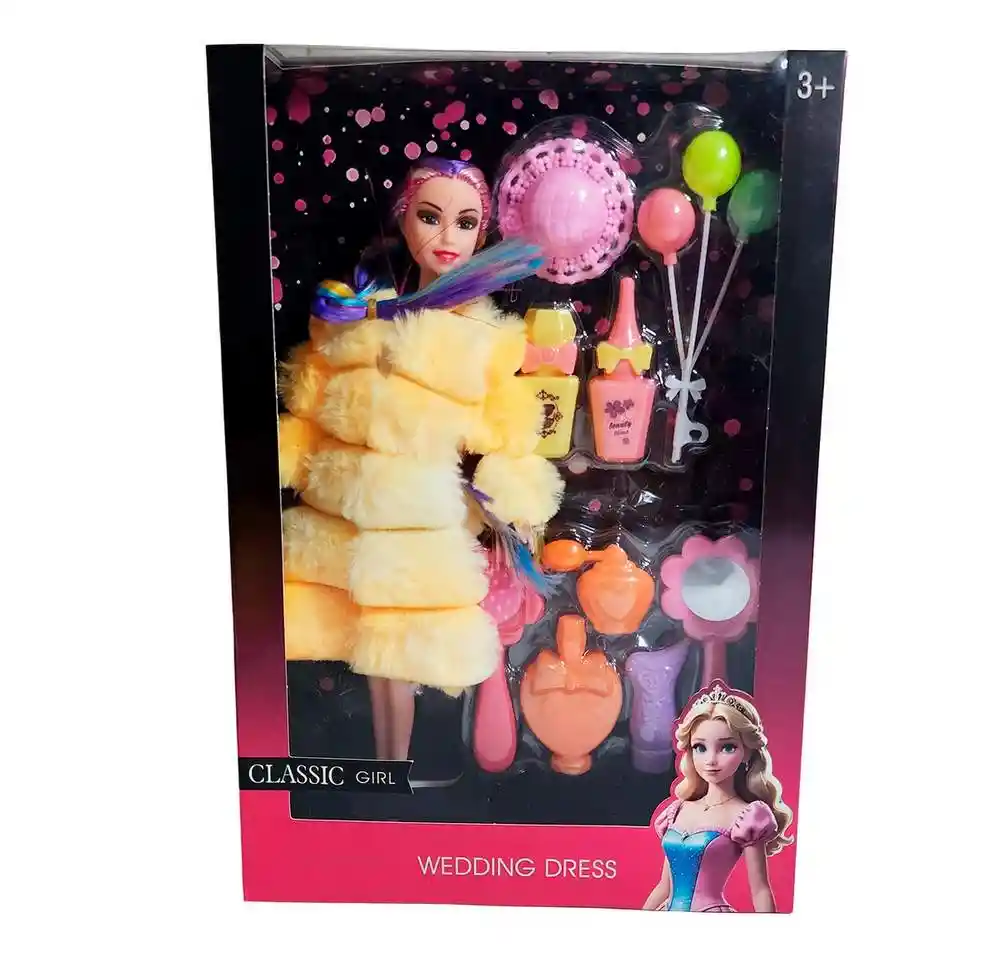 Despierta la imaginación y el glamour con este completo set de muñeca "Classic Girl", lista para deslumbrar en cualquier ocasión. Esta moderna muñeca destaca por su vibrante cabello con mechas de colores y su lujoso abrigo de peluche , marcando tendencia donde quiera que vaya. El set enriquece el juego con una fabulosa colección de accesorios, que incluye un elegante sombrero rosa, un set de globos festivos, y un completo tocador de belleza con espejo, cepillo, frascos de perfume y más. Es el regalo perfecto para niñas mayores de 3 años, inspirando horas de juego creativo, moda y fantásticas historias. Ficha Técnica: Dimensiones : 28 cm x 6 cm Material: Plástico ABS Edad recomendada + 3 Años Referencia: 628A3 ML-381D4 Certificado de conformidad: CS-LCO-13233-2021S2/432 ** _Para defectos de fábrica o retractos: \_Por favor revise el producto apenas lo reciba y antes de usarlo. No aplican ley de retracto o defectos de fábrica luego de usar el producto. Se manejan máximo 5 días para reportar defectos de fábrica (por ejemplo, producto funciona mal, piezas faltantes, rotas, etc). Para hacer efectiva la devolución el producto debe devolverse con el empaque original, el cual debe estar en buen estado, incluir todos los documentos y las partes completas y sin daños.