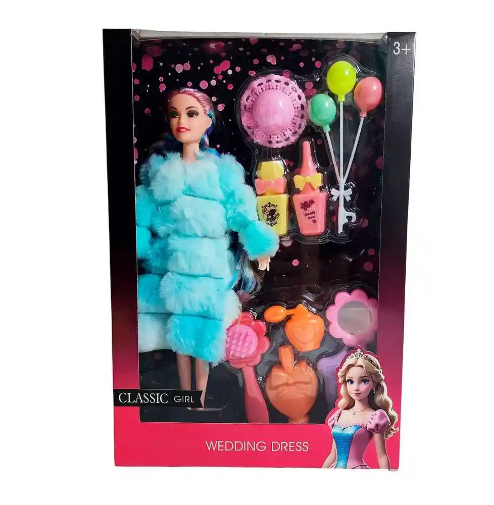 Despierta la imaginación y el glamour con este completo set de muñeca "Classic Girl", lista para deslumbrar en cualquier ocasión. Esta moderna muñeca destaca por su vibrante cabello con mechas de colores y su lujoso abrigo de peluche , marcando tendencia donde quiera que vaya. El set enriquece el juego con una fabulosa colección de accesorios, que incluye un elegante sombrero rosa, un set de globos festivos, y un completo tocador de belleza con espejo, cepillo, frascos de perfume y más. Es el regalo perfecto para niñas mayores de 3 años, inspirando horas de juego creativo, moda y fantásticas historias. Ficha Técnica: Dimensiones : 28 cm x 6 cm Material: Plástico ABS Edad recomendada + 3 Años Referencia: 628A3 ML-381D4 Certificado de conformidad: CS-LCO-13233-2021S2/432 ** _Para defectos de fábrica o retractos: \_Por favor revise el producto apenas lo reciba y antes de usarlo. No aplican ley de retracto o defectos de fábrica luego de usar el producto. Se manejan máximo 5 días para reportar defectos de fábrica (por ejemplo, producto funciona mal, piezas faltantes, rotas, etc). Para hacer efectiva la devolución el producto debe devolverse con el empaque original, el cual debe estar en buen estado, incluir todos los documentos y las partes completas y sin daños.