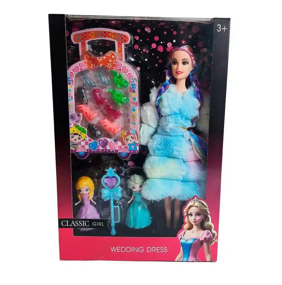 Lleva el juego de la moda a otro nivel con este increíble set de muñeca "Classic Girl", una verdadera fashionista lista para cualquier pasarela. Esta hermosa muñeca luce un espectacular cabello trenzado con mechas de colores y un lujoso abrigo de peluche que marca tendencia. Pero la diversión se multiplica con los accesorios: el set incluye un adorable carrito organizador en forma de tren repleto con 6 pares de zapatos de tacón de diferentes colores, un cetro mágico y, además, ¡dos encantadoras mini muñecas princesas para acompañarla en sus aventuras! Es el regalo ideal para niñas mayores de 3 años, perfecto para inspirar horas de juego de roles, estilismo y cuentos fantásticos. Ficha Técnica: Dimensiones : 28 cm x 6 cm Material: Plástico ABS Edad recomendada + 3 Años Referencia: JM1320 ML-381D3 Certificado de conformidad: CS-LCO-13233-2021S2/432 ** _Para defectos de fábrica o retractos: \_Por favor revise el producto apenas lo reciba y antes de usarlo. No aplican ley de retracto o defectos de fábrica luego de usar el producto. Se manejan máximo 5 días para reportar defectos de fábrica (por ejemplo, producto funciona mal, piezas faltantes, rotas, etc). Para hacer efectiva la devolución el producto debe devolverse con el empaque original, el cual debe estar en buen estado, incluir todos los documentos y las partes completas y sin daños.