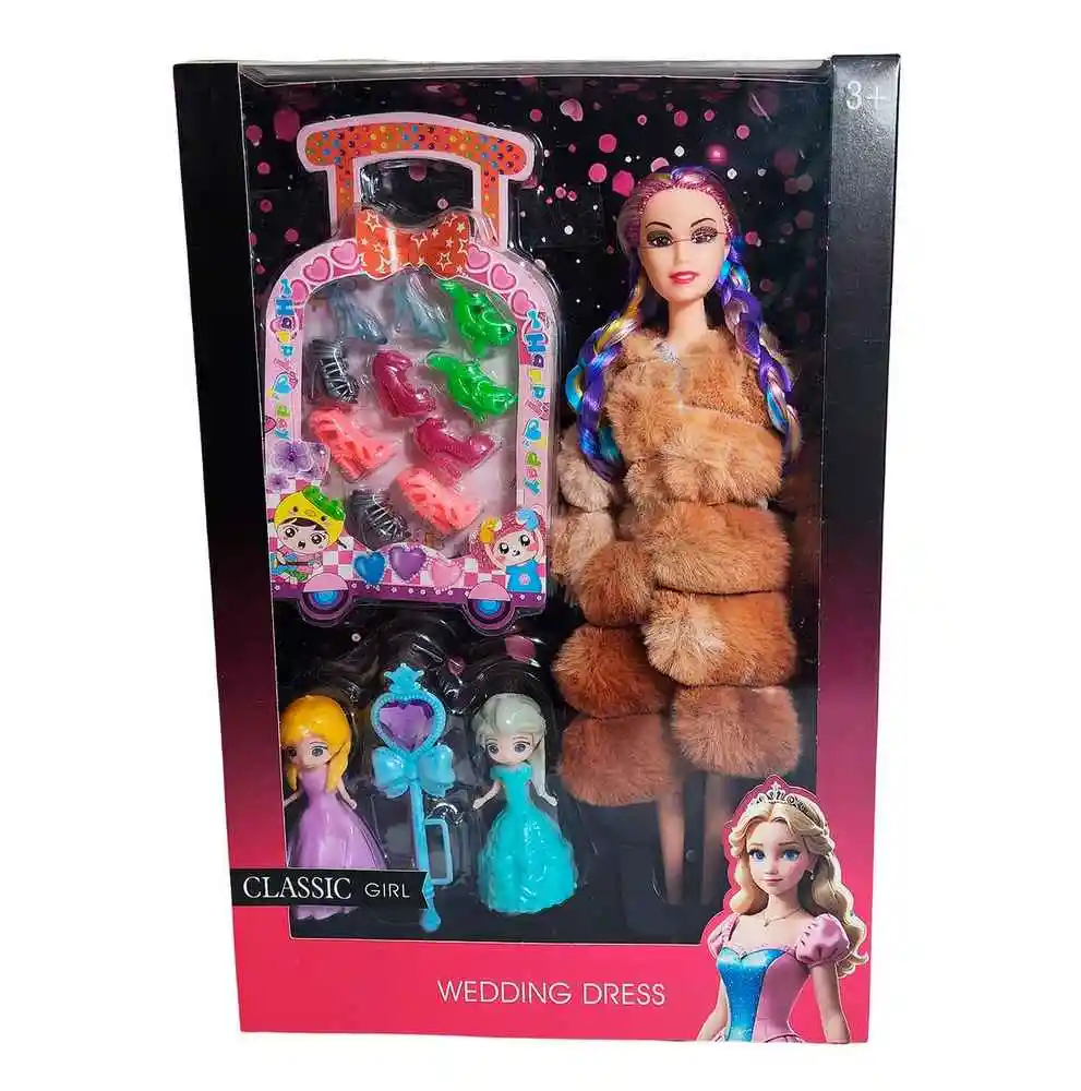 Lleva el juego de la moda a otro nivel con este increíble set de muñeca "Classic Girl", una verdadera fashionista lista para cualquier pasarela. Esta hermosa muñeca luce un espectacular cabello trenzado con mechas de colores y un lujoso abrigo de peluche que marca tendencia. Pero la diversión se multiplica con los accesorios: el set incluye un adorable carrito organizador en forma de tren repleto con 6 pares de zapatos de tacón de diferentes colores, un cetro mágico y, además, ¡dos encantadoras mini muñecas princesas para acompañarla en sus aventuras! Es el regalo ideal para niñas mayores de 3 años, perfecto para inspirar horas de juego de roles, estilismo y cuentos fantásticos. Ficha Técnica: Dimensiones : 28 cm x 6 cm Material: Plástico ABS Edad recomendada + 3 Años Referencia: JM1320 ML-381D3 Certificado de conformidad: CS-LCO-13233-2021S2/432 ** _Para defectos de fábrica o retractos: \_Por favor revise el producto apenas lo reciba y antes de usarlo. No aplican ley de retracto o defectos de fábrica luego de usar el producto. Se manejan máximo 5 días para reportar defectos de fábrica (por ejemplo, producto funciona mal, piezas faltantes, rotas, etc). Para hacer efectiva la devolución el producto debe devolverse con el empaque original, el cual debe estar en buen estado, incluir todos los documentos y las partes completas y sin daños.