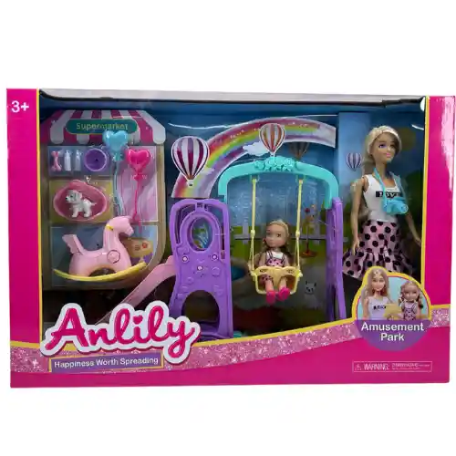 MUÑECA CON BEBE Y PARQUE DE DIVERCIONES PARA QUE LAS NIÑAS DE LO DISFRUTEN