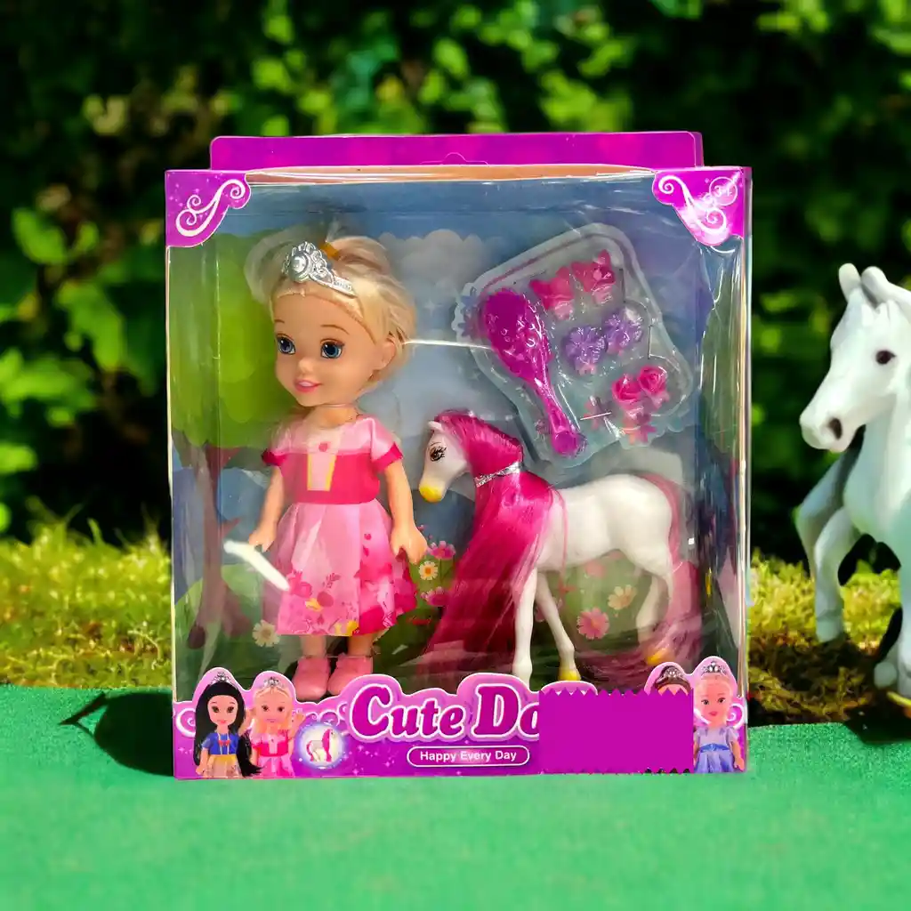 Hermosa muñeca con su mascota, un lindo pony de melena larga el cual podrá brindar horas de diversión ya que viene con accesorios para hacerle peinados medida: 18 cm alto