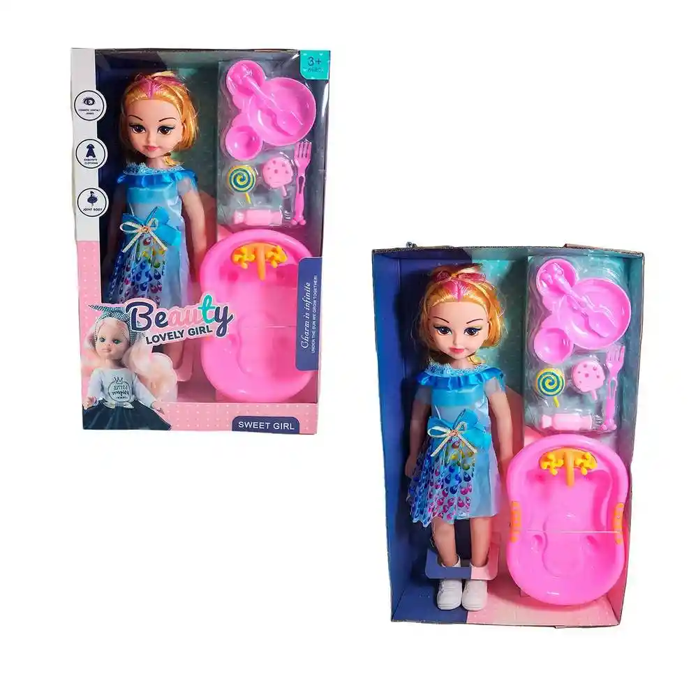 Despierta un mundo de encanto y juego imaginativo con esta "Beauty Lovely Girl", la muñeca "Sweet Girl" perfecta para tu pequeña. Esta adorable muñeca, con un cuerpo articulado ("Joint Body") para posar, deslumbra con su cabello con mechas y un vestido de satén con una falda de tul . El set de juego es súper completo, ya que incluye todo lo necesario para la hora del baño y la merienda: una bañera/lavamanos rosa, un set de platos, cubiertos, ollas y divertidas golosinas como una paleta y un helado. Es el regalo ideal para niñas mayores de 3 años, fomentando horas de historias y diversión. Ficha Técnica: Dimensiones : 41 cm x 12 cm Material: Plástico ABS Edad recomendada + 3 Años Referencia: JM-1320 463A3 Certificado de conformidad: CS-LCO-13233-2021S2/432 ** _Para defectos de fábrica o retractos: \_Por favor revise el producto apenas lo reciba y antes de usarlo. No aplican ley de retracto o defectos de fábrica luego de usar el producto. Se manejan máximo 5 días para reportar defectos de fábrica (por ejemplo, producto funciona mal, piezas faltantes, rotas, etc). Para hacer efectiva la devolución el producto debe devolverse con el empaque original, el cual debe estar en buen estado, incluir todos los documentos y las partes completas y sin daños.
