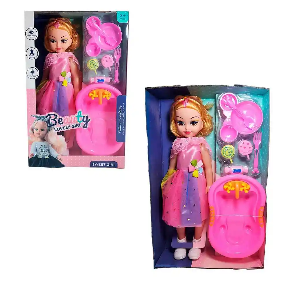 Despierta un mundo de encanto y juego imaginativo con esta "Beauty Lovely Girl", la muñeca "Sweet Girl" perfecta para tu pequeña. Esta adorable muñeca, con un cuerpo articulado ("Joint Body") para posar, deslumbra con su cabello con mechas y un vestido de satén con una falda de tul . El set de juego es súper completo, ya que incluye todo lo necesario para la hora del baño y la merienda: una bañera/lavamanos rosa, un set de platos, cubiertos, ollas y divertidas golosinas como una paleta y un helado. Es el regalo ideal para niñas mayores de 3 años, fomentando horas de historias y diversión. Ficha Técnica: Dimensiones : 41 cm x 12 cm Material: Plástico ABS Edad recomendada + 3 Años Referencia: JM-1320 463A3 Certificado de conformidad: CS-LCO-13233-2021S2/432 ** _Para defectos de fábrica o retractos: \_Por favor revise el producto apenas lo reciba y antes de usarlo. No aplican ley de retracto o defectos de fábrica luego de usar el producto. Se manejan máximo 5 días para reportar defectos de fábrica (por ejemplo, producto funciona mal, piezas faltantes, rotas, etc). Para hacer efectiva la devolución el producto debe devolverse con el empaque original, el cual debe estar en buen estado, incluir todos los documentos y las partes completas y sin daños.