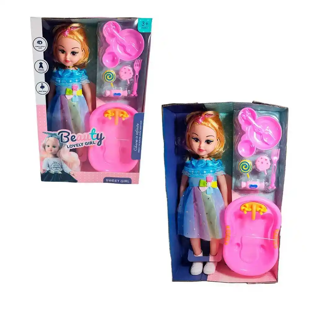 Despierta un mundo de encanto y juego imaginativo con esta "Beauty Lovely Girl", la muñeca "Sweet Girl" perfecta para tu pequeña. Esta adorable muñeca, con un cuerpo articulado ("Joint Body") para posar, deslumbra con su cabello con mechas y un vestido de satén con una falda de tul . El set de juego es súper completo, ya que incluye todo lo necesario para la hora del baño y la merienda: una bañera/lavamanos rosa, un set de platos, cubiertos, ollas y divertidas golosinas como una paleta y un helado. Es el regalo ideal para niñas mayores de 3 años, fomentando horas de historias y diversión. Ficha Técnica: Dimensiones : 41 cm x 12 cm Material: Plástico ABS Edad recomendada + 3 Años Referencia: JM-1320 463A3 Certificado de conformidad: CS-LCO-13233-2021S2/432 ** _Para defectos de fábrica o retractos: \_Por favor revise el producto apenas lo reciba y antes de usarlo. No aplican ley de retracto o defectos de fábrica luego de usar el producto. Se manejan máximo 5 días para reportar defectos de fábrica (por ejemplo, producto funciona mal, piezas faltantes, rotas, etc). Para hacer efectiva la devolución el producto debe devolverse con el empaque original, el cual debe estar en buen estado, incluir todos los documentos y las partes completas y sin daños.