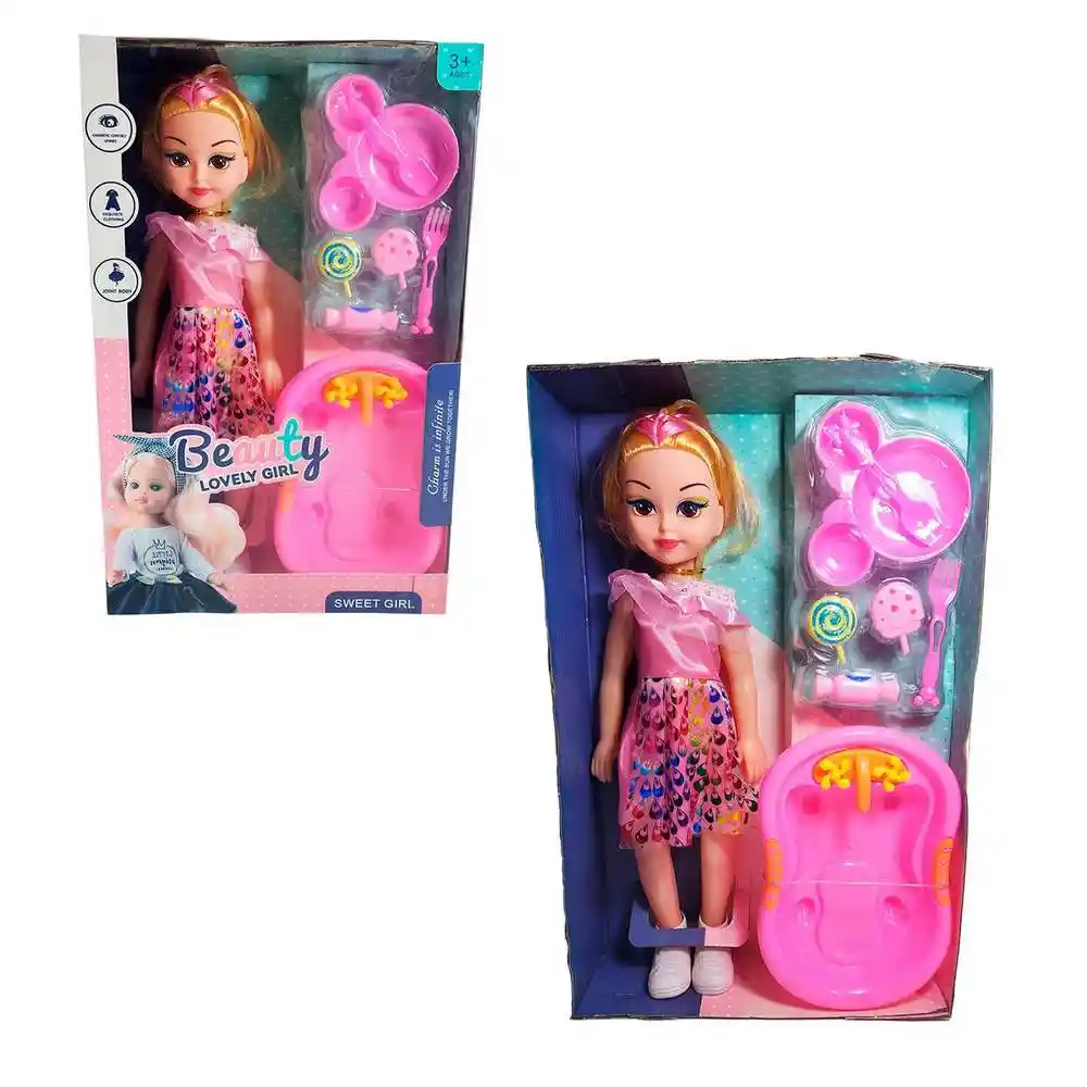 Despierta un mundo de encanto y juego imaginativo con esta "Beauty Lovely Girl", la muñeca "Sweet Girl" perfecta para tu pequeña. Esta adorable muñeca, con un cuerpo articulado ("Joint Body") para posar, deslumbra con su cabello con mechas y un vestido de satén con una falda de tul . El set de juego es súper completo, ya que incluye todo lo necesario para la hora del baño y la merienda: una bañera/lavamanos rosa, un set de platos, cubiertos, ollas y divertidas golosinas como una paleta y un helado. Es el regalo ideal para niñas mayores de 3 años, fomentando horas de historias y diversión. Ficha Técnica: Dimensiones : 41 cm x 12 cm Material: Plástico ABS Edad recomendada + 3 Años Referencia: JM-1320 463A3 Certificado de conformidad: CS-LCO-13233-2021S2/432 ** _Para defectos de fábrica o retractos: \_Por favor revise el producto apenas lo reciba y antes de usarlo. No aplican ley de retracto o defectos de fábrica luego de usar el producto. Se manejan máximo 5 días para reportar defectos de fábrica (por ejemplo, producto funciona mal, piezas faltantes, rotas, etc). Para hacer efectiva la devolución el producto debe devolverse con el empaque original, el cual debe estar en buen estado, incluir todos los documentos y las partes completas y sin daños.