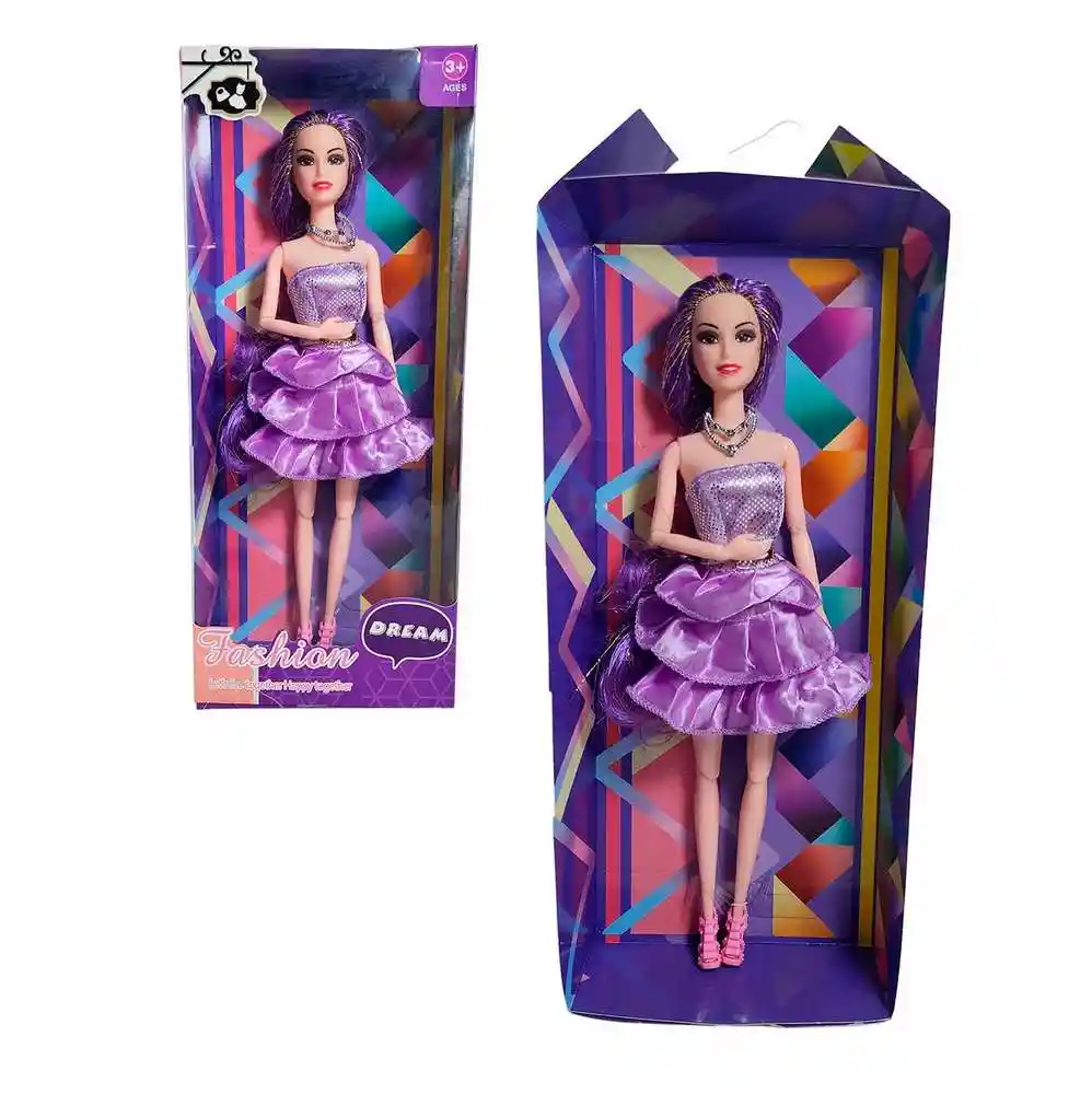 Inspira un mundo de glamour y sueños con esta deslumbrante muñeca "Fashion Dream" de la colección "Let's live together Happy together". Perfecta para niñas mayores de 3 años, esta muñeca brilla con luz propia gracias a su vibrante cabello y su espectacular vestido de fiesta a juego; el atuendo presenta un corpiño strapless brillante tipo lentejuela y una elegante falda de satén con múltiples volados. Completa con un collar plateado y tacones a juego, esta fashionista está lista para cualquier evento especial, fomentando horas de juego imaginativo y desfiles de moda. Ficha Técnica: Dimensiones : 28 cm x 7 cm Material: Plástico ABS Edad recomendada + 3 Años Referencia: JM-1332 ML-322C20 Certificado de conformidad: CS-LCO-13233-2021S2/432 ** _Para defectos de fábrica o retractos: \_Por favor revise el producto apenas lo reciba y antes de usarlo. No aplican ley de retracto o defectos de fábrica luego de usar el producto. Se manejan máximo 5 días para reportar defectos de fábrica (por ejemplo, producto funciona mal, piezas faltantes, rotas, etc). Para hacer efectiva la devolución el producto debe devolverse con el empaque original, el cual debe estar en buen estado, incluir todos los documentos y las partes completas y sin daños.