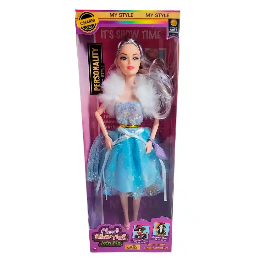 La muñeca Charm Show Time combina elegancia y fantasía en un solo look, luciendo un vestido brillante con detalles de tul y una capa de peluche que realza su estilo glamuroso. Con su cabello largo , es perfecta para inspirar juegos de moda, desfiles y momentos llenos de imaginación. Ficha Técnica: Materiales : Plástico ABS Dimensiones: 27 cm x 9 cm x 5 cm Edad recomendada : + 3 años en adelante Material suave, cómodo, seguro, no tóxico Certificado de conformidad: SL-CS-210044 Referencia: 628A18 617B4 Términos de garantía: Para defectos de fábrica o retractos: Por favor revise el producto apenas lo reciba y antes de usarlo. No aplican ley de retracto o defectos de fábrica luego de usar el producto. Se manejan máximo 5 días para reportar defectos de fábrica (por ejemplo, producto funciona mal, piezas faltantes, rotas, etc). Para hacer efectiva la devolución el producto debe devolverse con el empaque original, el cual debe estar en buen estado, incluir todos los documentos y las partes completas y sin daños.