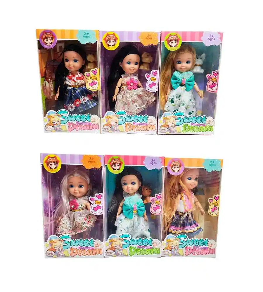Descubre el encantador mundo de las muñecas "Sweet Dream", el regalo perfecto para tener una infancia feliz ("Give you a happy childhood"). Esta adorable colección presenta una variedad de muñecas articuladas, cada una con su propio estilo único, incluyendo diferentes colores de cabello (rubio, negro) y hermosos atuendos, como vestidos florales o faldas con collares. Pero la dulzura no termina ahí: cada muñeca viene acompañada de su inseparable y diminuta mascota, un tierno perrito. Ideales para niñas mayores de 3 años, estas muñecas son perfectas para coleccionar e inspirar horas de juego imaginativo y dulces sueños. Ficha Técnica: Dimensiones : 14 cm x 6 cm Material: Plástico ABS Edad recomendada + 3 Años Referencia: 1522A3 139-3 Certificado de conformidad: CS-LCO-13233-2021S2/432 ** _Para defectos de fábrica o retractos: \_Por favor revise el producto apenas lo reciba y antes de usarlo. No aplican ley de retracto o defectos de fábrica luego de usar el producto. Se manejan máximo 5 días para reportar defectos de fábrica (por ejemplo, producto funciona mal, piezas faltantes, rotas, etc). Para hacer efectiva la devolución el producto debe devolverse con el empaque original, el cual debe estar en buen estado, incluir todos los documentos y las partes completas y sin daños.
