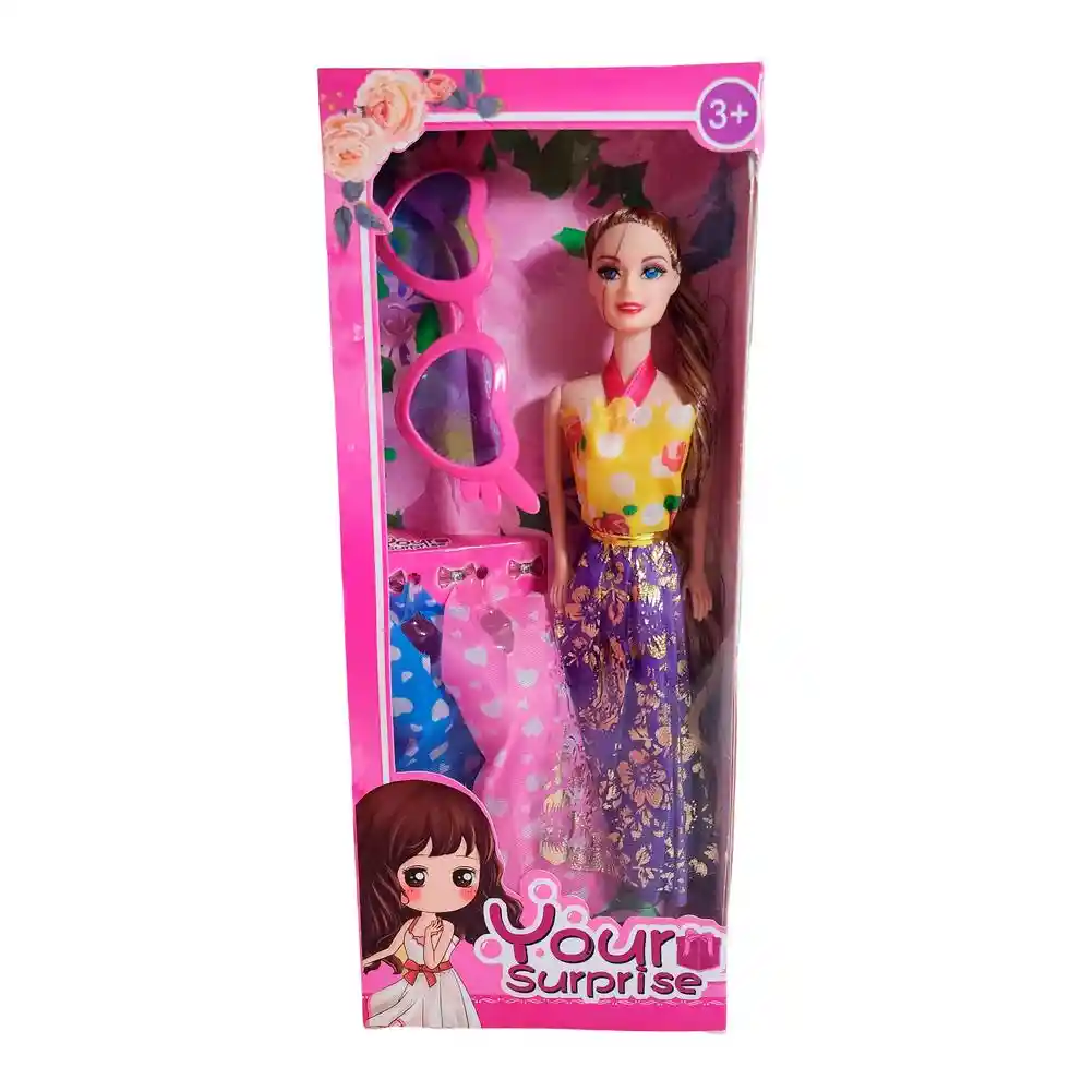 La muñeca Your Surprise es una compañera ideal para el juego creativo, con un hermoso vestido estampado con detalles brillantes, gafas grandes y accesorios que permiten cambiar su estilo en cualquier momento; incluye dos faldas adicionales para que las niñas puedan inventar nuevas combinaciones y disfrutar horas de diversión mientras desarrollan su imaginación y habilidades de moda; recomendada para niñas a partir de 3 años, es un regalo perfecto que combina estilo, juego interactivo y muchos looks diferentes en un solo set. Ficha Técnica: Dimensiones : 27 cm x 6 cm Material: Plástico ABS Edad Apta : + 3 años Referencia: HZ2034A ZY004B12 Certificado de conformidad: E5-0359-2021 Términos de Garantía: Para defectos de fábrica o retractos: Por favor revise el producto apenas lo reciba y antes de usarlo. No aplican ley de retracto o defectos de fábrica luego de usar el producto. Se manejan máximo 5 días para reportar defectos de fábrica (por ejemplo, producto funciona mal, piezas faltantes, rotas, etc). Para hacer efectiva la devolución el producto debe devolverse con el empaque original, el cual debe estar en buen estado, incluir todos los documentos y las partes completas y sin daños.