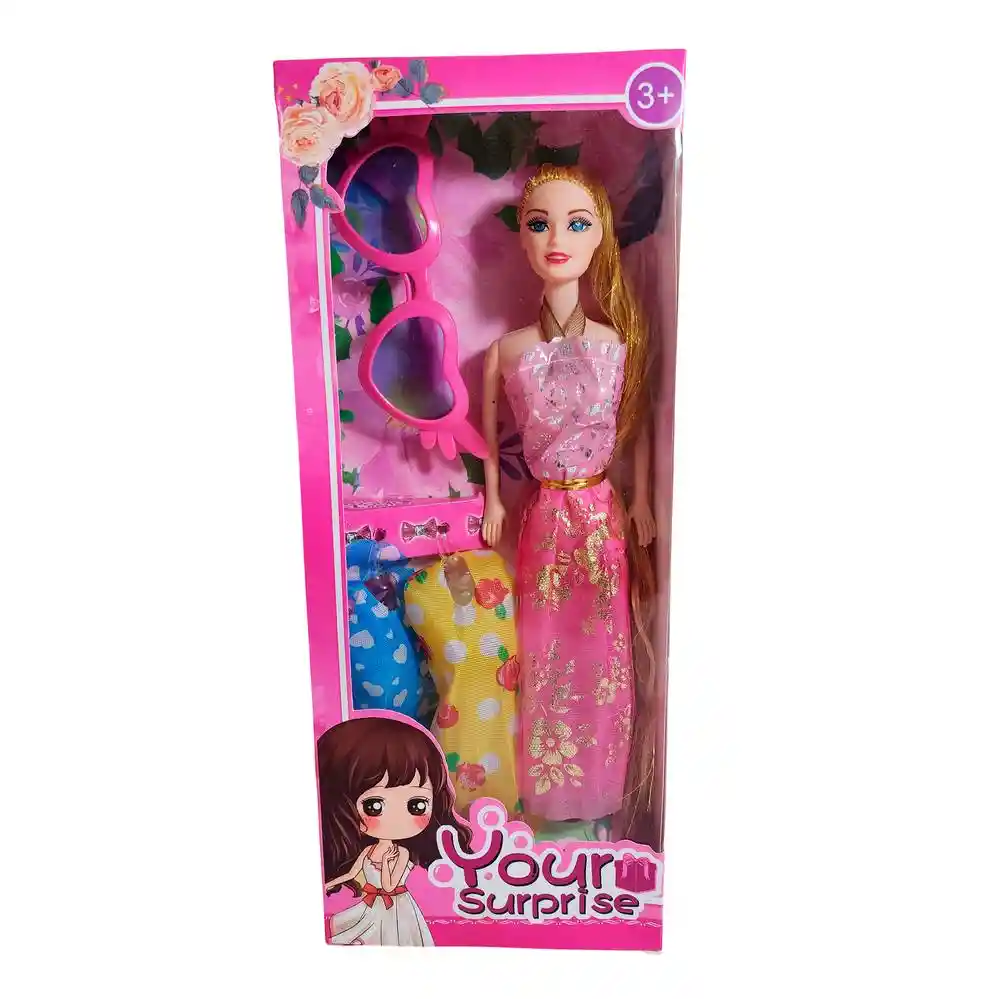 La muñeca Your Surprise es una compañera ideal para el juego creativo, con un hermoso vestido estampado con detalles brillantes, gafas grandes y accesorios que permiten cambiar su estilo en cualquier momento; incluye dos faldas adicionales para que las niñas puedan inventar nuevas combinaciones y disfrutar horas de diversión mientras desarrollan su imaginación y habilidades de moda; recomendada para niñas a partir de 3 años, es un regalo perfecto que combina estilo, juego interactivo y muchos looks diferentes en un solo set. Ficha Técnica: Dimensiones : 27 cm x 6 cm Material: Plástico ABS Edad Apta : + 3 años Referencia: HZ2034A ZY004B12 Certificado de conformidad: E5-0359-2021 Términos de Garantía: Para defectos de fábrica o retractos: Por favor revise el producto apenas lo reciba y antes de usarlo. No aplican ley de retracto o defectos de fábrica luego de usar el producto. Se manejan máximo 5 días para reportar defectos de fábrica (por ejemplo, producto funciona mal, piezas faltantes, rotas, etc). Para hacer efectiva la devolución el producto debe devolverse con el empaque original, el cual debe estar en buen estado, incluir todos los documentos y las partes completas y sin daños.
