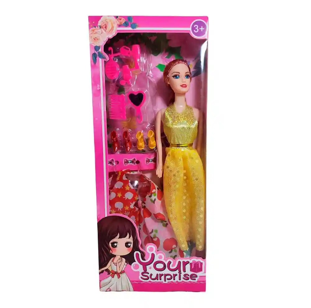 Muñeca Your Surprise con vestido brillante y accesorios para cambiar de estilo, ideal para niñas que disfrutan del juego creativo. Incluye un hermoso vestido con detalles de brillo, un conjunto adicional de ropa, varios pares de zapatos y accesorios como cepillos, perchas y lazos. Su diseño moderno y colorido estimula la imaginación y promueve el juego de roles mientras las pequeñas crean diferentes looks para su muñeca. Perfecta para regalar y vivir momentos llenos de diversión y moda. Ficha Técnica: Materiales : Plástico ABS Dimensiones: 28 cm x 6 cm Edad recomendada : + 3 años en adelante Certificado de conformidad: SL-CS-210044 Referencia: HZ2034A ZY004C3 Términos de garantía: Para defectos de fábrica o retractos: Por favor revise el producto apenas lo reciba y antes de usarlo. No aplican ley de retracto o defectos de fábrica luego de usar el producto. Se manejan máximo 5 días para reportar defectos de fábrica (por ejemplo, producto funciona mal, piezas faltantes, rotas, etc). Para hacer efectiva la devolución el producto debe devolverse con el empaque original, el cual debe estar en buen estado, incluir todos los documentos y las partes completas y sin daños.