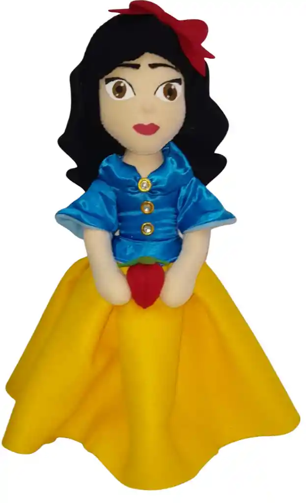 Muñeca artesanal inspirada en Blancanieves, confeccionada en tela y fieltro con acabados hechos a mano. Luce su icónico vestido de falda amarilla amplia y blusa azul satinada con botones dorados, acompañado de una cinta roja en el cabello que resalta sobre su melena negra. La muñeca sostiene una manzana roja, símbolo clásico de su historia, y tiene una expresión dulce y delicada que la convierte en una pieza encantadora. Perfecta como regalo temático, decoración de colección o detalle especial para fans de los cuentos de hadas.