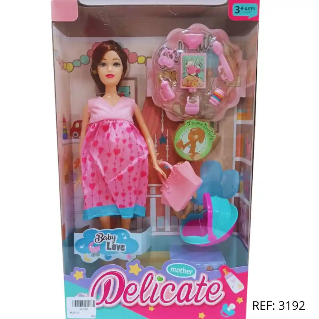 Muñeca embarazada con accesorios y bebé incluido. Ideal para juegos creativos y horas de diversión.