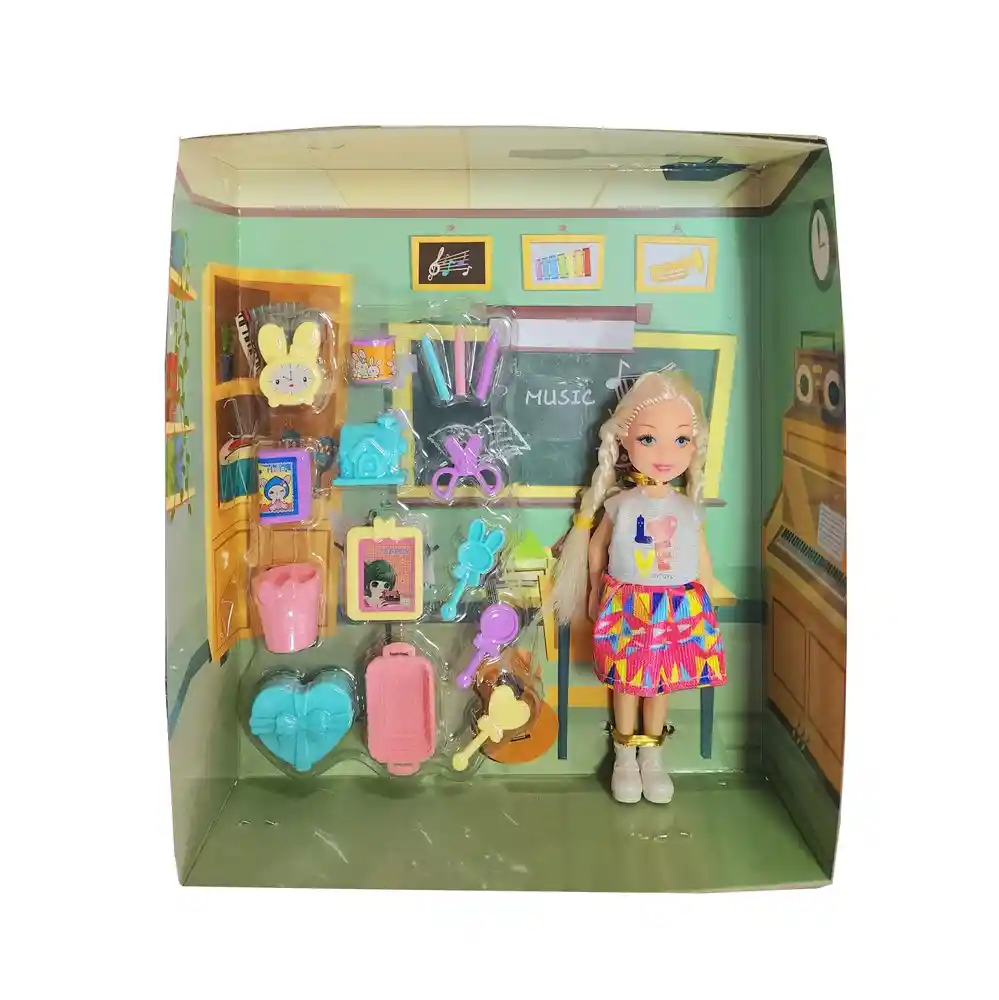 Hermosa muñeca acompañada de sus accesorios escolares para que las pequeñas de la casa se diviertan , Esta se enciende Presionando el botón del collar de la muñeca sonara música La caja incluye : 1 muñeca y accesorios Ficha Técnica: Dimensiones muñeca : 12 cm x 4 cm Dimensiones del empaque: 22 cm x 28 cm x 6 cm Material: PVC / plástico ABS / Polipropileno no tóxico. Edad recomendada: + 3 años Referencia: C3834 Certificado de conformidad: E5-0359-2021 Términos de garantía: Para defectos de fábrica o retractos: Por favor revise el producto apenas lo reciba y antes de usarlo. No aplican ley de retracto o defectos de fábrica luego de usar el producto. Se manejan máximo 5 días para reportar defectos de fábrica (por ejemplo, producto funciona mal, piezas faltantes, rotas, etc). Para hacer efectiva la devolución el producto debe devolverse con el empaque original, el cual debe estar en buen estado, incluir todos los documentos y las partes completas y sin daños. Garantía del vendedor: 1 meses