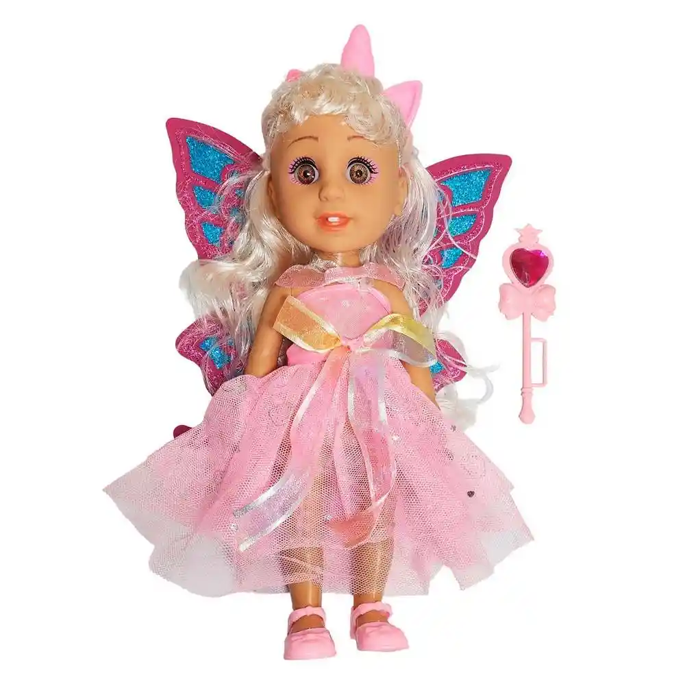 Encantadora muñeca hada Sweetheart Baby, perfecta para llenar de magia los juegos infantiles. Viste un hermoso vestido con detalles brillantes y lazos multicolor, acompañada de alas de hada y una corona rosada que resalta su encanto. Incluye una varita mágica para crear historias llenas de fantasía y diversión. Ideal para estimular la imaginación, la creatividad y el juego de roles. Recomendado para niñas mayores de 3 años. Ficha Técnica: Materiales : Plástico ABS Dimensiones: 25 cm x 10 cm Edad recomendada : + 3 años en adelante Certificado de conformidad: SL-CS-210044 Referencia: 279A-1 YG1903A4 Términos de garantía: Para defectos de fábrica o retractos: Por favor revise el producto apenas lo reciba y antes de usarlo. No aplican ley de retracto o defectos de fábrica luego de usar el producto. Se manejan máximo 5 días para reportar defectos de fábrica (por ejemplo, producto funciona mal, piezas faltantes, rotas, etc). Para hacer efectiva la devolución el producto debe devolverse con el empaque original, el cual debe estar en buen estado, incluir todos los documentos y las partes completas y sin daños.