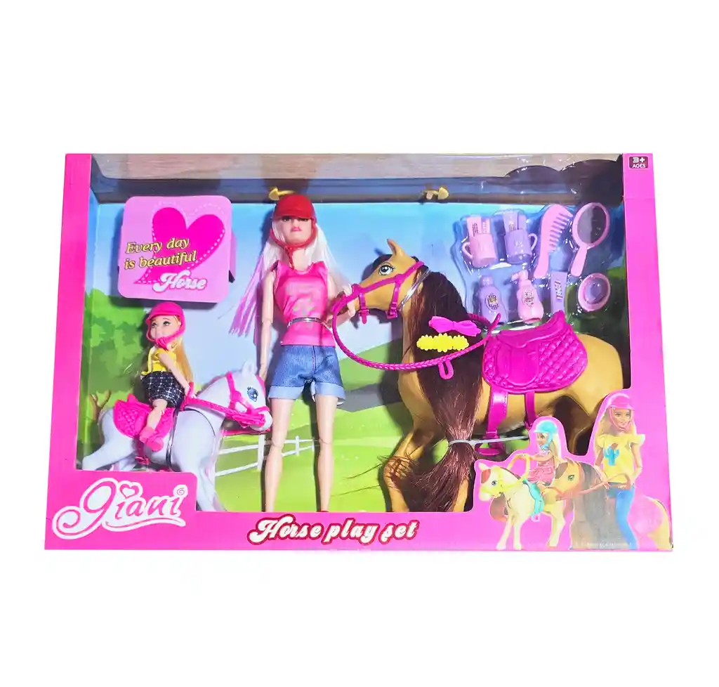 Esta muñeca jinete viene acompañada de su hermoso caballo de larga cabellera, junto con una variedad de accesorios para su cuidado, además de incluir una muñeca mini con un pequeño poni de juguete, creando un set perfecto para quienes disfrutan del mundo de la equitación y el juego imaginativo. Ficha Técnica: Dimensiones Muñeca: 29 cm x 9 cm Dimensiones del empaque : 46 cm x 32 cm x 8 cm Material: Plástico ABS Edad recomendada: + 3 años Referencia: JT015A Certificado de conformidad: CS-LCO-13233-2021S2/432 ** _Para defectos de fábrica o retractos: \_Por favor revise el producto apenas lo reciba y antes de usarlo. No aplican ley de retracto o defectos de fábrica luego de usar el producto. Se manejan máximo 5 días para reportar defectos de fábrica (por ejemplo, producto funciona mal, piezas faltantes, rotas, etc). Para hacer efectiva la devolución el producto debe devolverse con el empaque original, el cual debe estar en buen estado, incluir todos los documentos y las partes completas y sin daños.