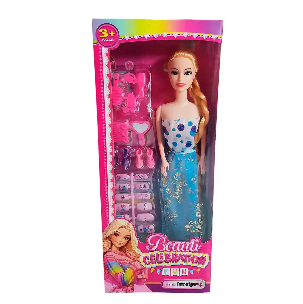 La muñeca Beauti Celebration Fun es ideal para las niñas que aman la moda y la creatividad. Con un diseño elegante y una gran variedad de accesorios, permite crear múltiples estilos y combinaciones para cada ocasión. Incluye zapatos, peines, joyas y complementos que estimulan la imaginación y el juego de roles. Fabricada con materiales resistentes y acabados de calidad, es perfecta como regalo para quienes disfrutan explorar el mundo del estilo y la belleza. Recomendado para mayores de 3 años. Ficha Técnica: Dimensiones : 29 cm x 5 cm Material: Plástico ABS Edad recomendada: + 3 años Referencia: 628A19 620A6 Certificado de conformidad: E5-0359-2021 ** _Para defectos de fábrica o retractos: \_Por favor revise el producto apenas lo reciba y antes de usarlo. No aplican ley de retracto o defectos de fábrica luego de usar el producto. Se manejan máximo 5 días para reportar defectos de fábrica (por ejemplo, producto funciona mal, piezas faltantes, rotas, etc). Para hacer efectiva la devolución el producto debe devolverse con el empaque original, el cual debe estar en buen estado, incluir todos los documentos y las partes completas y sin daños.