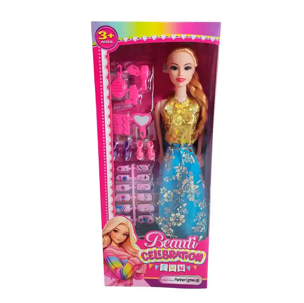 La muñeca Beauti Celebration Fun es ideal para las niñas que aman la moda y la creatividad. Con un diseño elegante y una gran variedad de accesorios, permite crear múltiples estilos y combinaciones para cada ocasión. Incluye zapatos, peines, joyas y complementos que estimulan la imaginación y el juego de roles. Fabricada con materiales resistentes y acabados de calidad, es perfecta como regalo para quienes disfrutan explorar el mundo del estilo y la belleza. Recomendado para mayores de 3 años. Ficha Técnica: Dimensiones : 29 cm x 5 cm Material: Plástico ABS Edad recomendada: + 3 años Referencia: 628A19 620A6 Certificado de conformidad: E5-0359-2021 ** _Para defectos de fábrica o retractos: \_Por favor revise el producto apenas lo reciba y antes de usarlo. No aplican ley de retracto o defectos de fábrica luego de usar el producto. Se manejan máximo 5 días para reportar defectos de fábrica (por ejemplo, producto funciona mal, piezas faltantes, rotas, etc). Para hacer efectiva la devolución el producto debe devolverse con el empaque original, el cual debe estar en buen estado, incluir todos los documentos y las partes completas y sin daños.