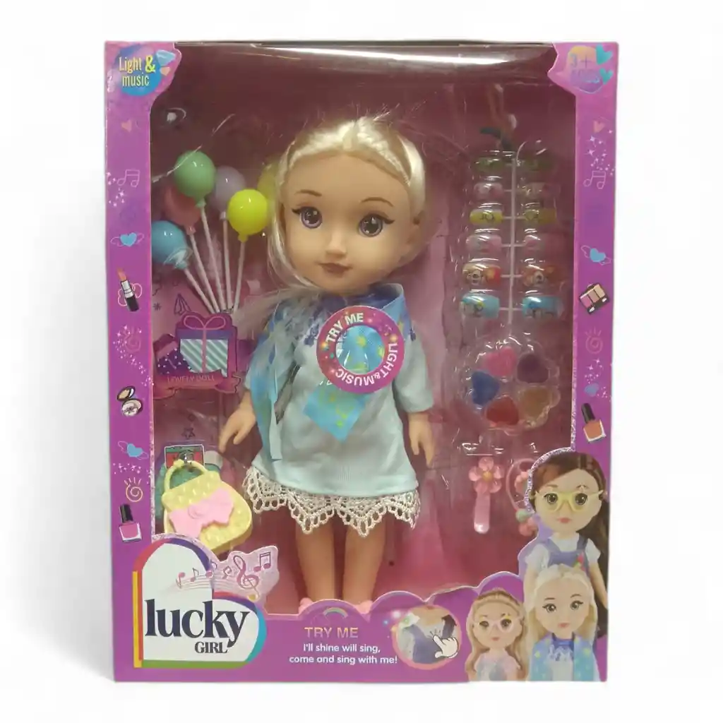 Muñeca30 cms aprox. musical con globos, accesorios maquillaje y uñas